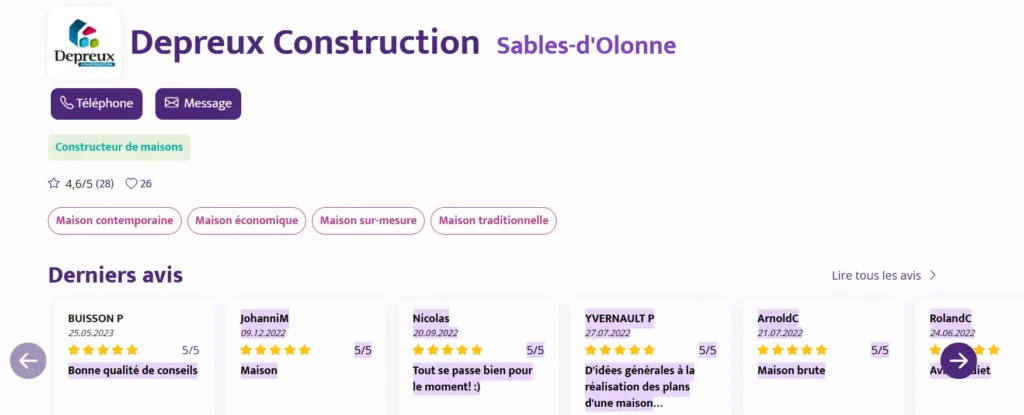Les avis sur Depreux Construction disponibles sur les plateformes spécialisées reflètent une satisfaction globale autour de plusieurs critères récurrents :