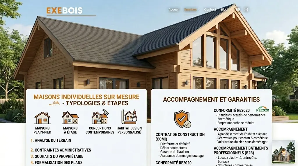 - L’entreprise propose quatre types de prestations : construction neuve, extension, rénovation et bâtiments professionnels, couvrant ainsi aussi bien les particuliers que les professionnels.